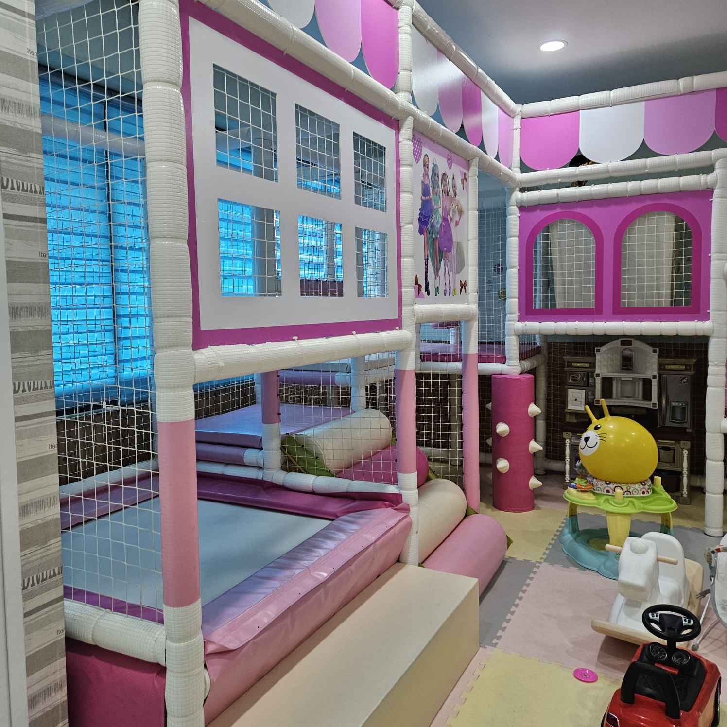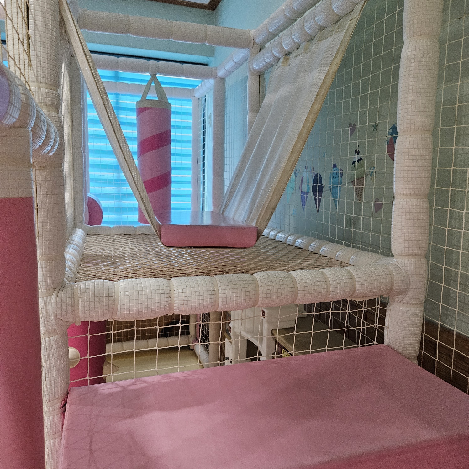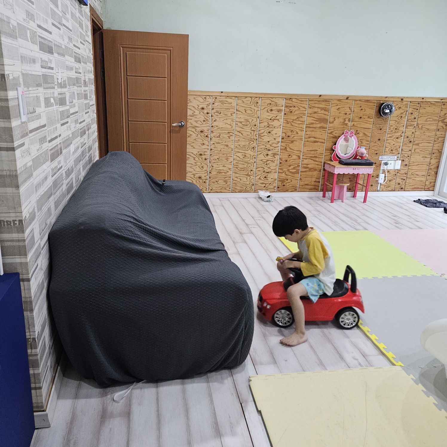 하필 여행 첫날 하늘에 구멍 난 듯 비가 쏟아져 내려 엄청 걱정했는데 다행히 도착해서 30분 정도 지나니 비가 잠시 그치고 해가 반짝 뜨길래 서둘러 아이들 래쉬가드로 갈아 입히고 수영장으로 직행했네요. 방에 폰을 두고 나와 수영장에서 놀아준 사진은 찍지 못했지만 아이들과 갈 땐 반드시 튜브를 챙겨가야 해요. 생각보다 깊이가 있어요. 어른들 가슴까지 오는 깊이라 저희는 두 아들 모두 튜브에 동동 띄어 놀아주었습니다. 산속 물이라 그런건지 엄청 차가워서 오래 놀지는 못했네요. 첫째가 들어간지 5분만에 너무 추워해서 10분도 되지 않아 물놀이 끝내고 후다닥 방으로 가서 씻기고 거실에 설치된 정글짐에서 신나게 뛰어놀았답니다.