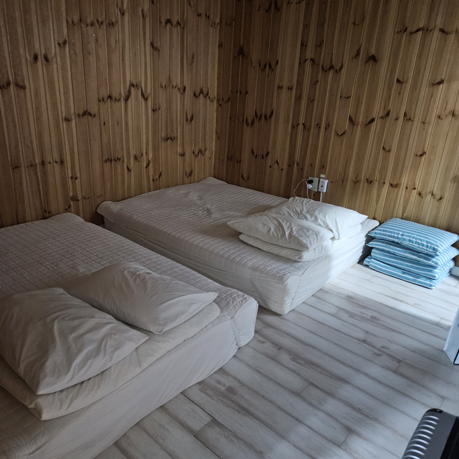 티비는 방에 설치가 되어 있고 방에는 더블 사이즈 침대매트리스가 바닥에 두개 놓아져 있었구요. 메인 이불과 베개는 모두 새하얀 커버와 도톰한 이불로 셋팅되어 있어요. 여분의 배게와 이불도 2세트 일반 이불과 토퍼가 있습니다. 티비는 kt여서 올레티비 무료시청컨텐츠 들어가서 틀어주니 아이들이 뛰어놀다 지칠 땐 티비도 볼게 많았어요. 이불은 모두 뽀송하니 세탁이 잘 되어 있었답니다.