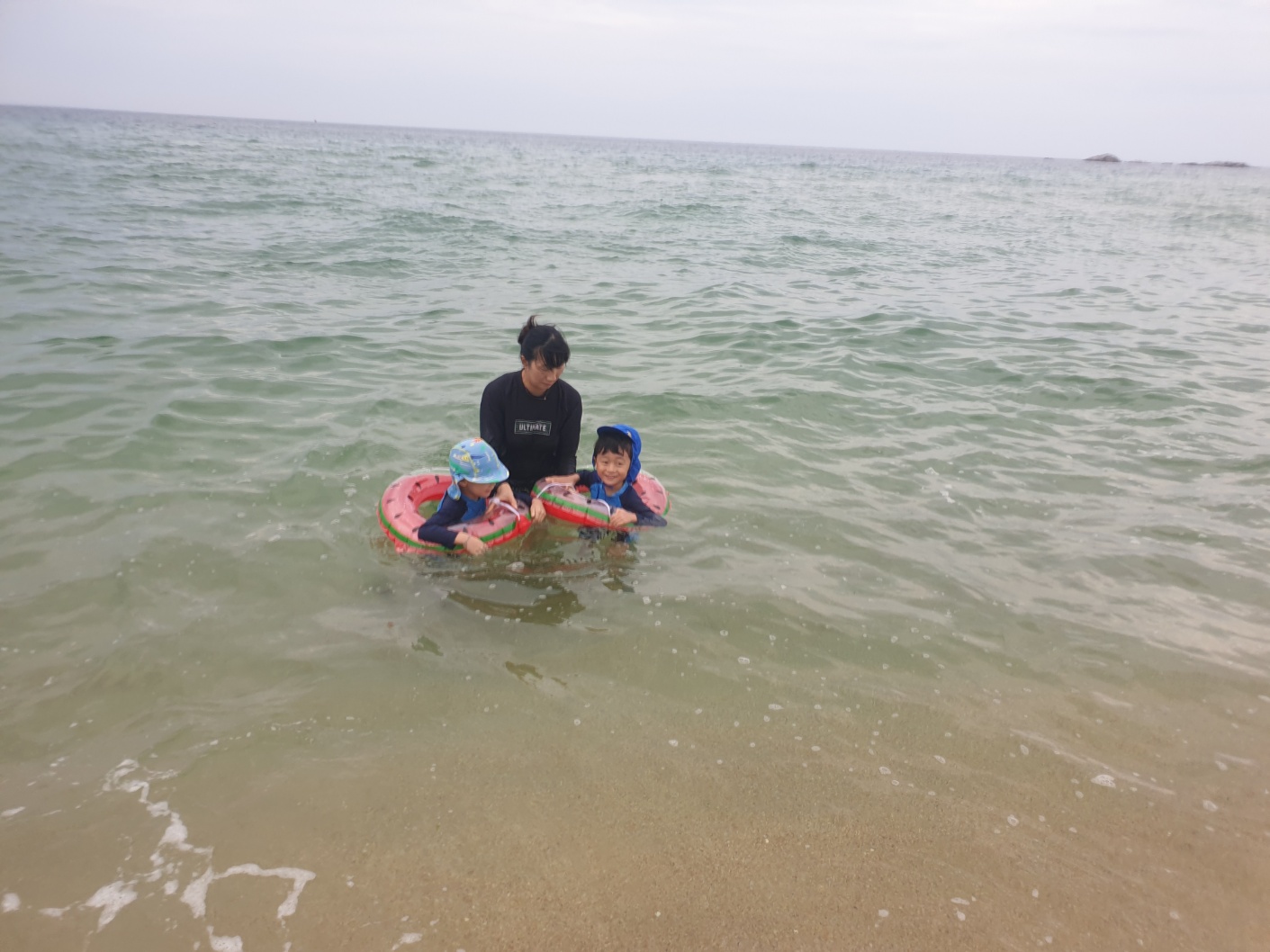 경포해변과 가까운 곳으로 잡은 숙소 넘버25 호텔에 도착해서 서둘러 아이들 물놀이 준비를 시키고 꼼꼼하게 썬크림도 발라주며 야심차게 준비해서 경포해변으로 갔어요. 비는 오지 않았지만 흐린 날씨와 간간히 부는 바람으로 아이들이 추울까봐 많이 걱정했지만 경포해변에 도착해서 보니 우리 아이들보다 어린 아이들도 열심히 물놀이 하고 모래 놀이 즐기며 놀고 있더라구요. 처음엔 우리 두 개구쟁이 녀석들 물 속엔 안들어가고 모래위에 앉아 살짝 촉감만 느끼다가 큰 아이부터 밀려 오는 파도에 관심을 보이며 발을 담그고 도망가며 신나게 뛰어 놀더니 철푸덕 넘어지면서 그때부터 물놀이가 시작 되었습니다. 처음에 들어 갈 땐 물이 상당히 차갑게 느껴졌는데 2~3분 지나니까 오히려 물 속이 따뜻하고 괜찮더라구요. 튜브에 몸을 맞기고 엄마는 열심히 아이들과 소통하며 물속에서 고분분투하고 아빠는 열심히 밖에서 사진찍기 열중하며 바람불고 흐린 날에도 1시간을 놀았네요!