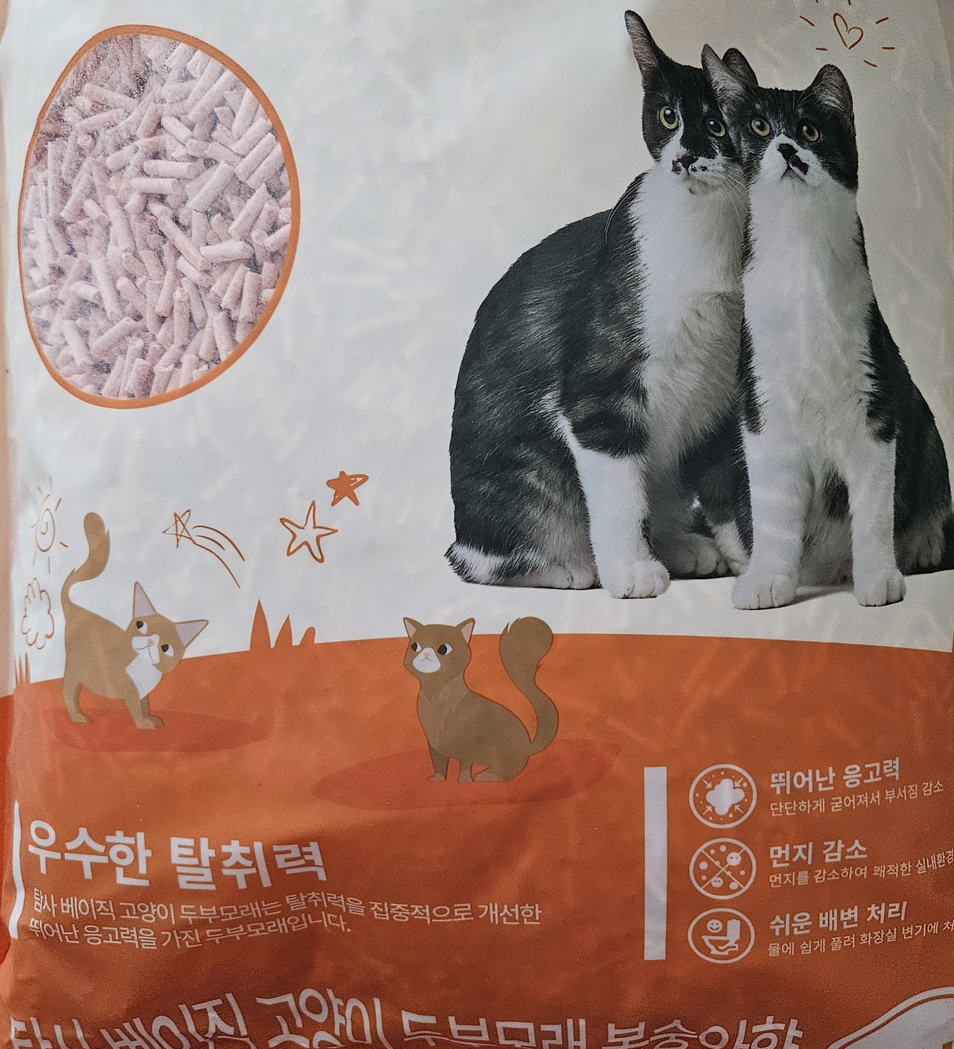 우리 냥이가 가장 좋아하는 두부모래 탐사 베이직 프리미엄 두부모래 복숭아향 제품입니다. 우선 입자는 굵은 모래입자입니다. 가는 입자를 선호한다면 탐사 베이직에서 가는 입자도 있으니 사용해 보셔도 좋을 것 같아요! 우리 냥이는 가는 입자를 선호하지 않아서 굵은 입자로 꾸준히 사용하고 있어요. 탐사 베이직 프리미엄 두부모래는 오리지널, 베이비파우더향, 복숭아향, 라베더향, 녹차향 등 5가지가 있는데 저희 냥이는 복숭아 행을 제일 좋아해서 되도록이면 복숭아향과 라벤더향 위주로 사용하고 있습니다. 탐사 베이직 프리미엄 두부모래는 가성비가 굉장히 좋은데 제품의 품질도 굉장히 퀄리티 좋습니다. 일단 탈취력에 집중 했다고 써 있길래 의구심을 가지고 사용 한 첫 날 정말 벤토 못지 않게 잘 잡아주고 응고력도 좋았습니다. 현재 성묘인 우리 냥이 쉬아 양이 큰데도 묵직하게 잘 뭉쳐주어 평균적으로 7L 한봉지 부어주고 조금씩 보충해 주며 3주에 한번씩 화장실 전체 청소를 해주고 있습니다. 가성비 좋은 두부모래 찾는다면 성분도 성능도 좋은 탐사 베이직 두부모래 써보세요. 가성비 좋은 두부모래 이다보니 냥이의 발과 피부 건강을 생각해서 화장실 전체 청소도 자주 해줄 수 있고 공기청정기도 덜 돌아가서 굉장히 만족하는 제품입니다.