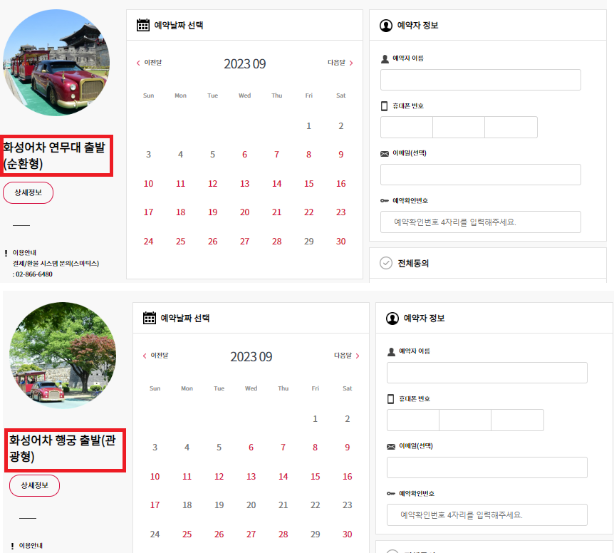 위에는 순환형을 클릭 했을 때 나오는 화면이고, 아래는 관광형을 클릭 했을 때 나오는 화면입니다. 반드시 왼쪽 사진 순환형인지 관광형인지 잘 확인 한 후 예약을 진행하세요. 달력을 보면 현재 빨간색으로 표시된 날짜는 예약이 가능한 날짜입니다. 눌러보면 시간대 별로 잔여 좌석이 뜨기 때문에 원하는 시간대로 클릭 후 해당되는 표를 선택하세요. 경로우대, 장애우대, 단체우대, 직종 관련 우대 등 다양하게 있으니 할인 해당 되는 부분이 있다면 선택 후 예약자 정보 입력 후 전체 동의 클릭, 결제방법을 선택 한 뒤 결제하면 예약이 완료됩니다.