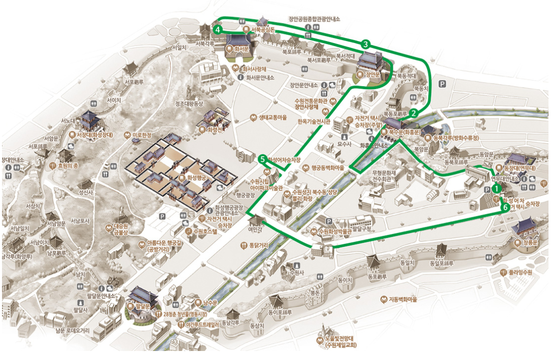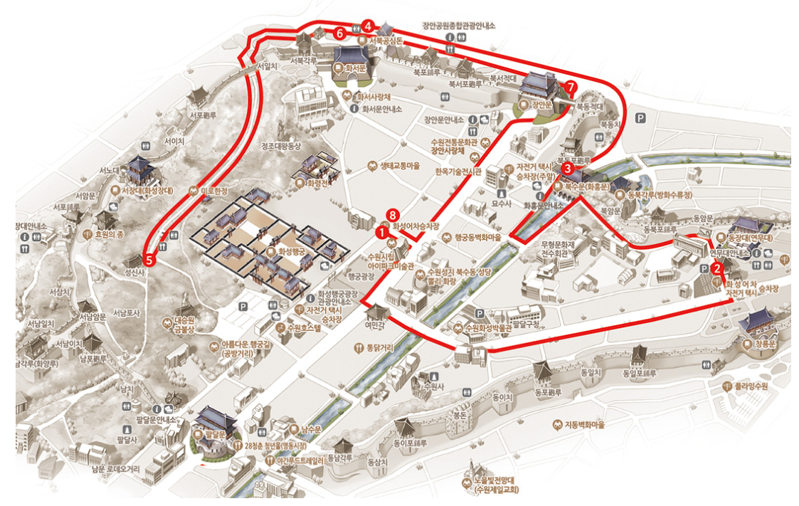 화성행궁 (수원시립아이파크미술관 주차장 입구 옆) → 연무대 (하차가능) → 화홍문(하차가능) → 화서문 (하차가능) → 팔달산 (하차가능) → 화서문 → 장안문 → 화성행궁 (미술관)