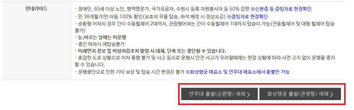 수원 화성어차를 예약하는 사이트는 위에 바로가기 누르시면 바로 예약 화면으로 이동됩니다. 소개 글을 보시며 아래로 내려보면 안내가이드 글 밑으로 제가 빨간색 박스로 체크해 놓았는데요. 두 가지 중에 하나를 선택 하여 눌러주세요.