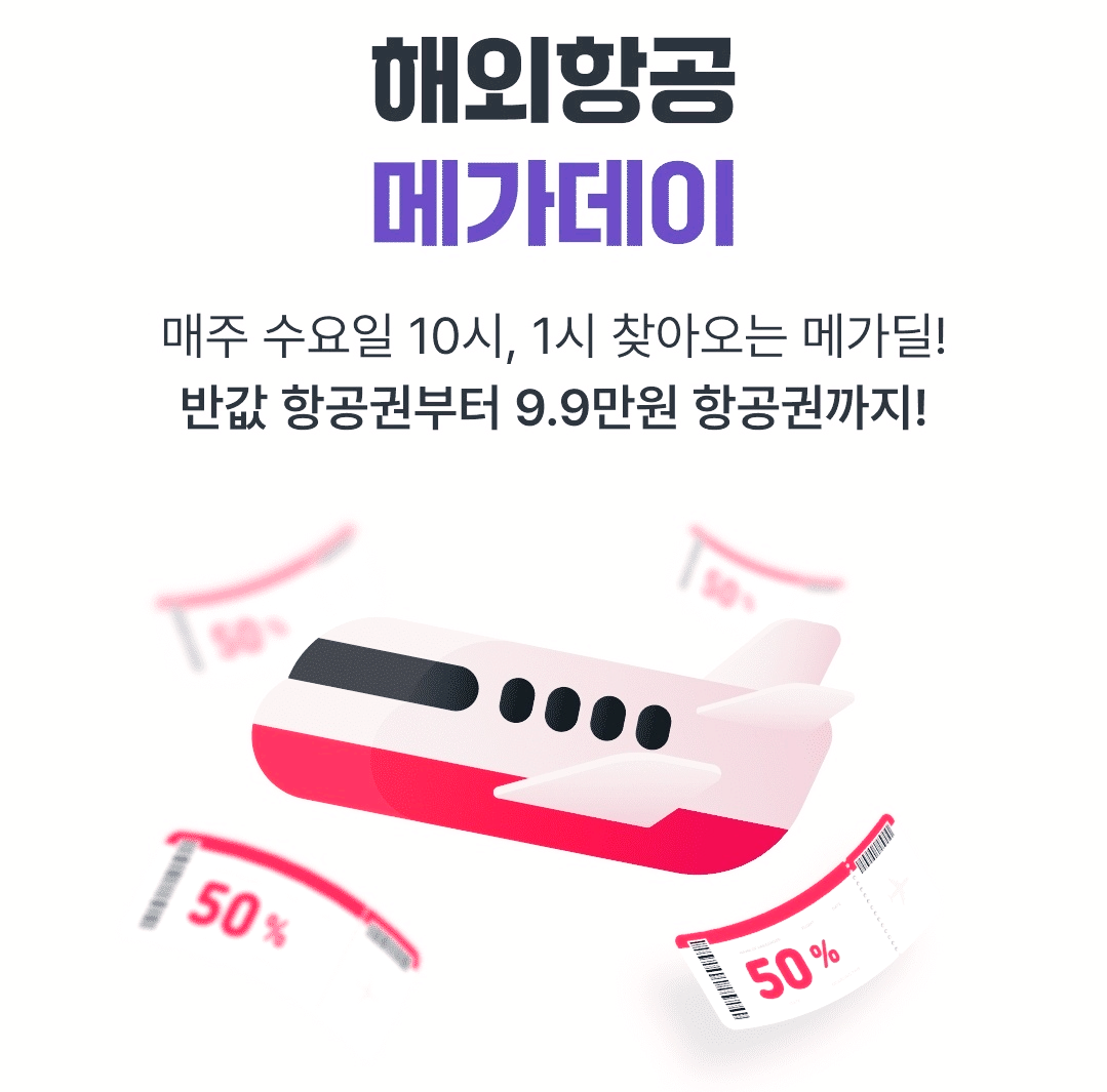 여기어때 해외 항공권 반값 딜 항공 메가데이 이벤트는 매주 수요일 10시, 1시 진행이 됩니다.
