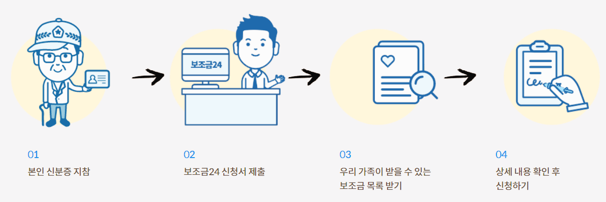가까운 읍 • 면 • 동 주민센터에 방문하여 보조금24 신청서를 제출하면 우리 가족이 받을 수 있는 보조금을 확인할 수 있습니다.