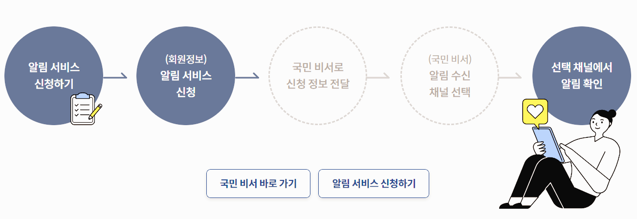 알림 서비스 신청하면 국민 비서로 생애 주기별 내가 받을 수 있는 보조금과 신청한 서비스 처리 현황에 대한 알림을 받을 수 있습니다.(아래 사진 참고)