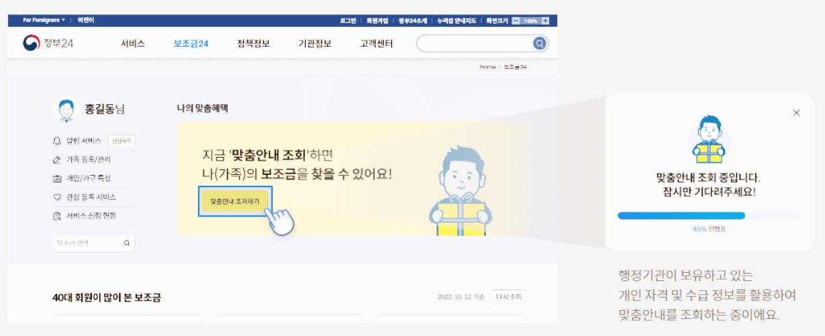 보조금 24에서 조회를 하기 위해서는 반드시 정부24 회원가입을 먼저 해야만 조회와 신청이 모두 가능합니다. 보조금24의 맞춤안내 서비스는 정부24 회원 대상 서비스입니다. 꼭 회원가입을 먼저 진행하시길 바랍니다.