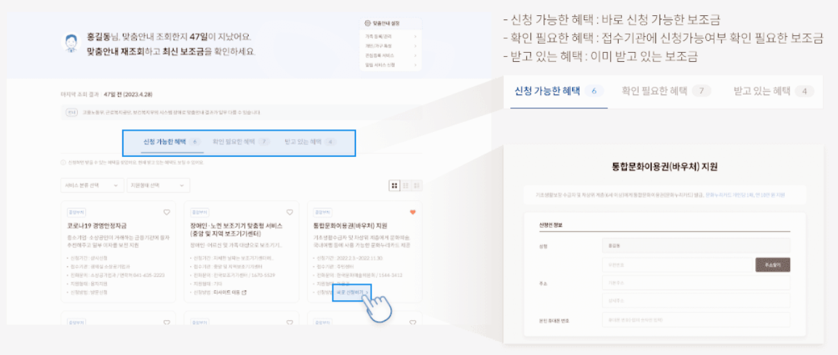4. 맞춤안내 조회가 완료되면 받을 수 있는 보조금, 이미 받고 있는 보조금 정보를 확인하고 보조금24에서 바로 싱청할 수 있습니다.