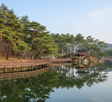호수 위로 펼쳐지는 잔잔한 물결과 수변 데크길은