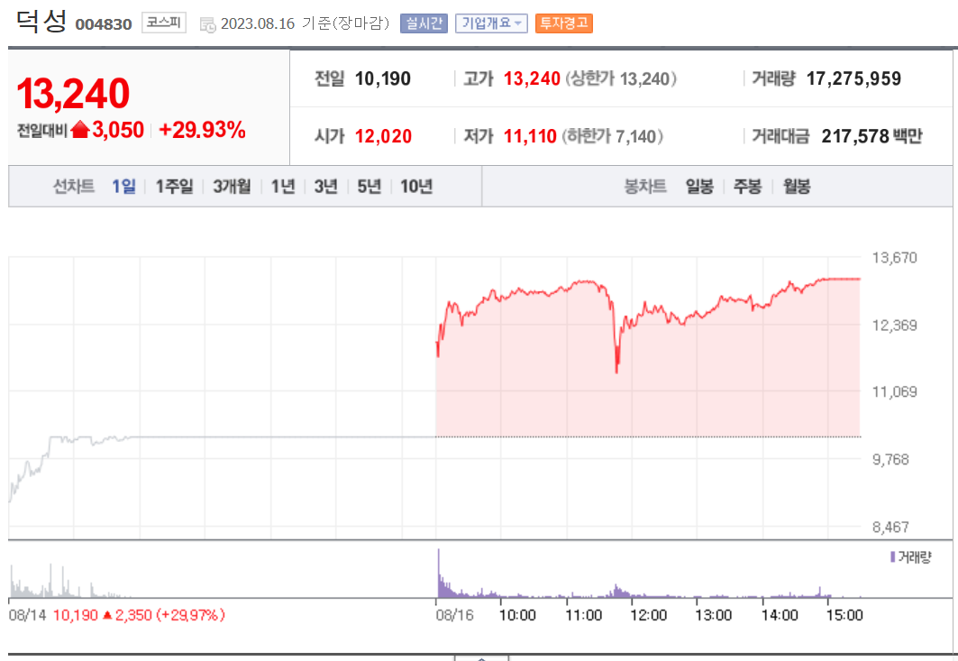 덕성이란 기업은 "환경과 사람을 생각하는 기업" 이라는 안내로 기업을 소개하고 있네요. 회사의 비젼이 "친환경 글로벌 초우량 기업으로 '최상의 친환경적이고 혁신적인 제품을 생산 공급하는 친환경 글로벌 초우량기업이 된다' 라고 하니 초전도체 뿐만 아니라 기업의 주식이 상승세를 타는 조건은 많이 갖추고 있는 것 같네요.