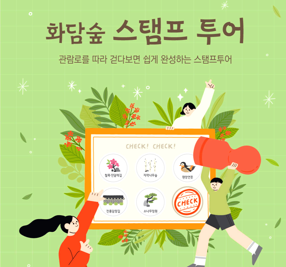 현재 진행중인 이벤트 화담숲 스탬트 투어가 있어요. 스탬프의 위치는 철쭉, 진달래길, 자작나무숲, 소나무정원, 전통담장길, 원앙연못 이라고 합니다. 모두 방문하여 스탬프를 완료할 시 화담숲 기념품 증정 이벤트를 진행하고 있다고 해요. 화담숲 스탬프를 모두 완료하면 "화담숲 매표소 방문 수령"을 통해 받으시면 됩니다.