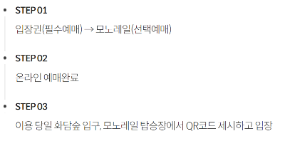 - 모노레일은 선택사항으로 입장권만 구매도 가능함 (단, 해당일에 현장에선 모노레일 잔여석이 있을 시만 현장발권이 가능함.)