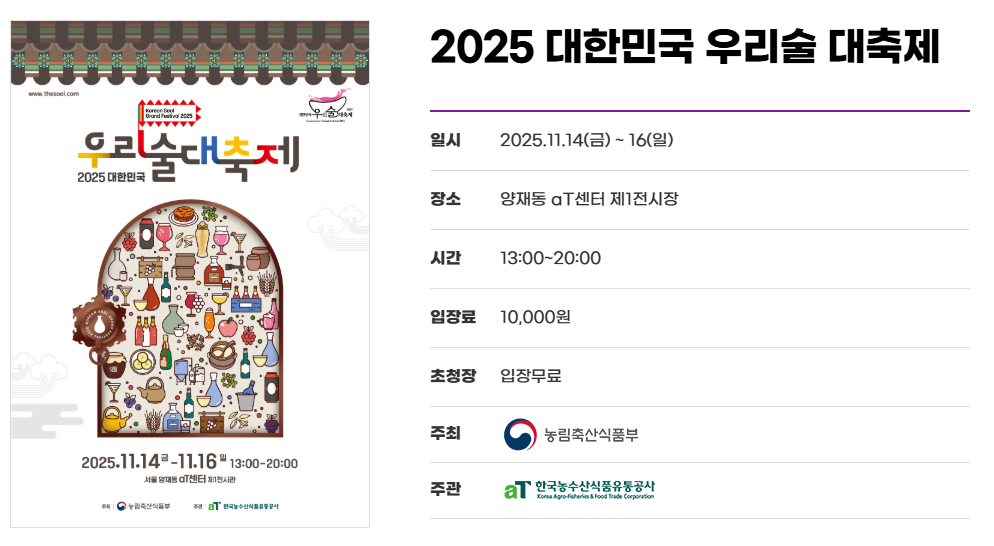 전통주의 매력과 가치를 한자리에서 느낄 수 있는 2025 대한민국 우리술대축제가 돌아옵니다! 이번 축제는 2025년 11월 14일(금)부터 11월 16일(일)까지 3일간, 서울 양재동 aT센터 제1전시장에서 개최되며, 전국 각지의 우수한 전통주 양조장들이 참여하는 국내 최대 규모의 전통주 행사입니다.