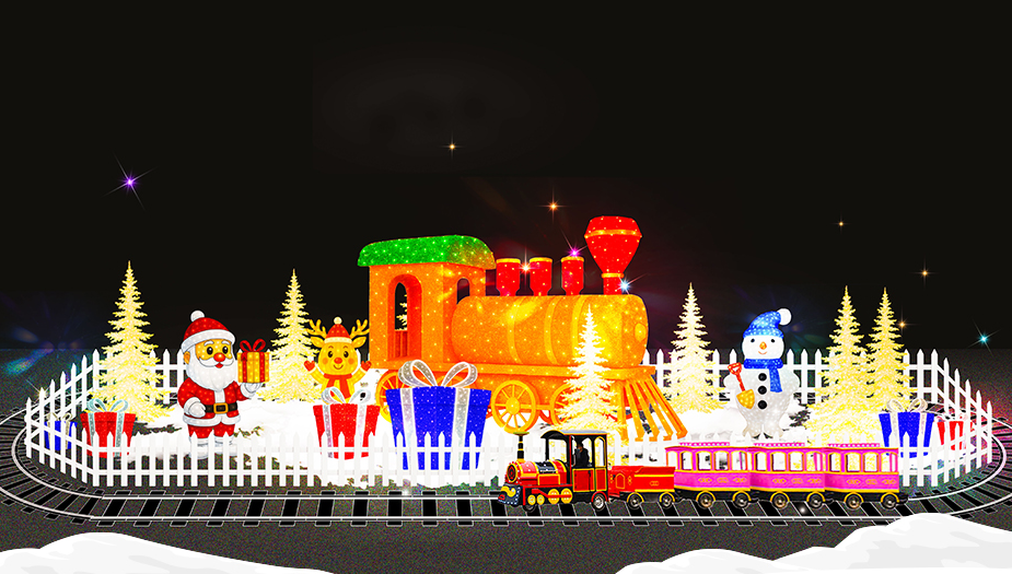 반짝이는 조명 아래 케이크 트리와 선물 오브제가 이어지는 길을 따라 천천히 운행하며,